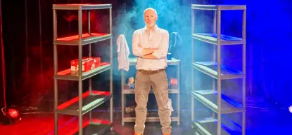 Ben werkt in het magazijn. Tussen de stellingen: “Maar hier wordt niet geschoten…”.