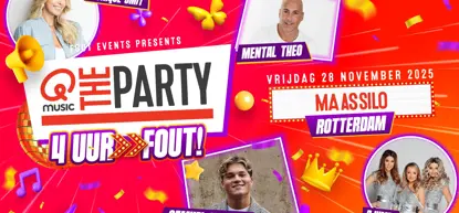 ## Foute Hits en Spectaculaire Shows Op 28 november staat Rotterdam in het teken van Qmusic the Party FOUT!. Verwacht een avond vol foute hits, spectaculaire shows en veel gekkigheid. De muziek varieert van de jaren 90 tot de jaren 2000, met een mix van hardere stijlen tot Nederlandstalige nummers. Bereid je voor op een snelle en leuke avond. ## Artiesten en Informatie Er zijn optredens van artiesten als Mental Theo, Monique Smit, Djumbo en Qmusic-dj’s.