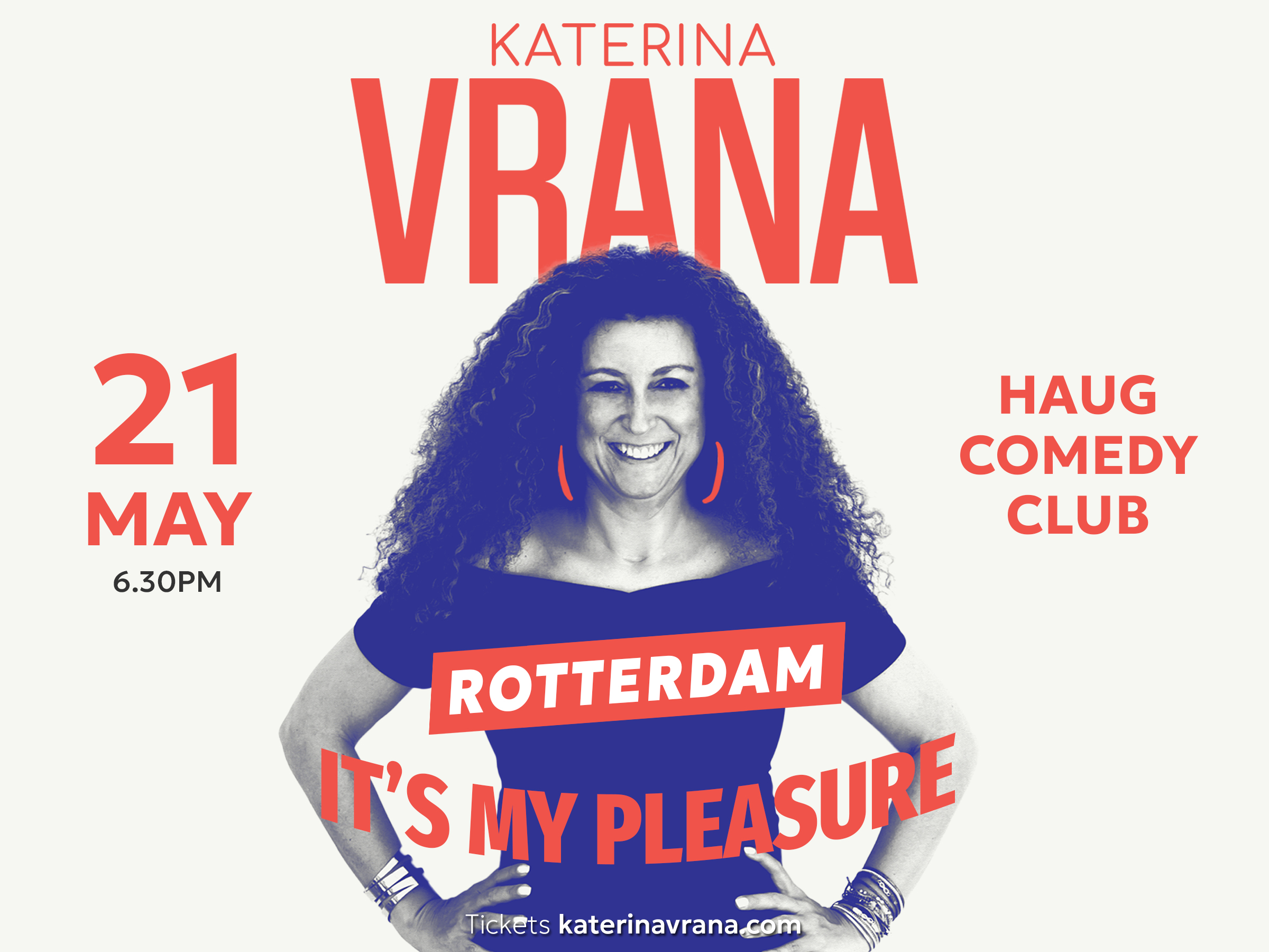Katerina Vrana, een cabaretière van wereldklasse, strijkt neer in Rotterdam met haar veelgeprezen show ‘It’s My Pleasure!’. Haar optreden in Comedy Club Haug belooft een avond vol scherpe humor en ontroerende momenten. Je bent welkom bij een show die je meeneemt op een unieke reis door haar leven.