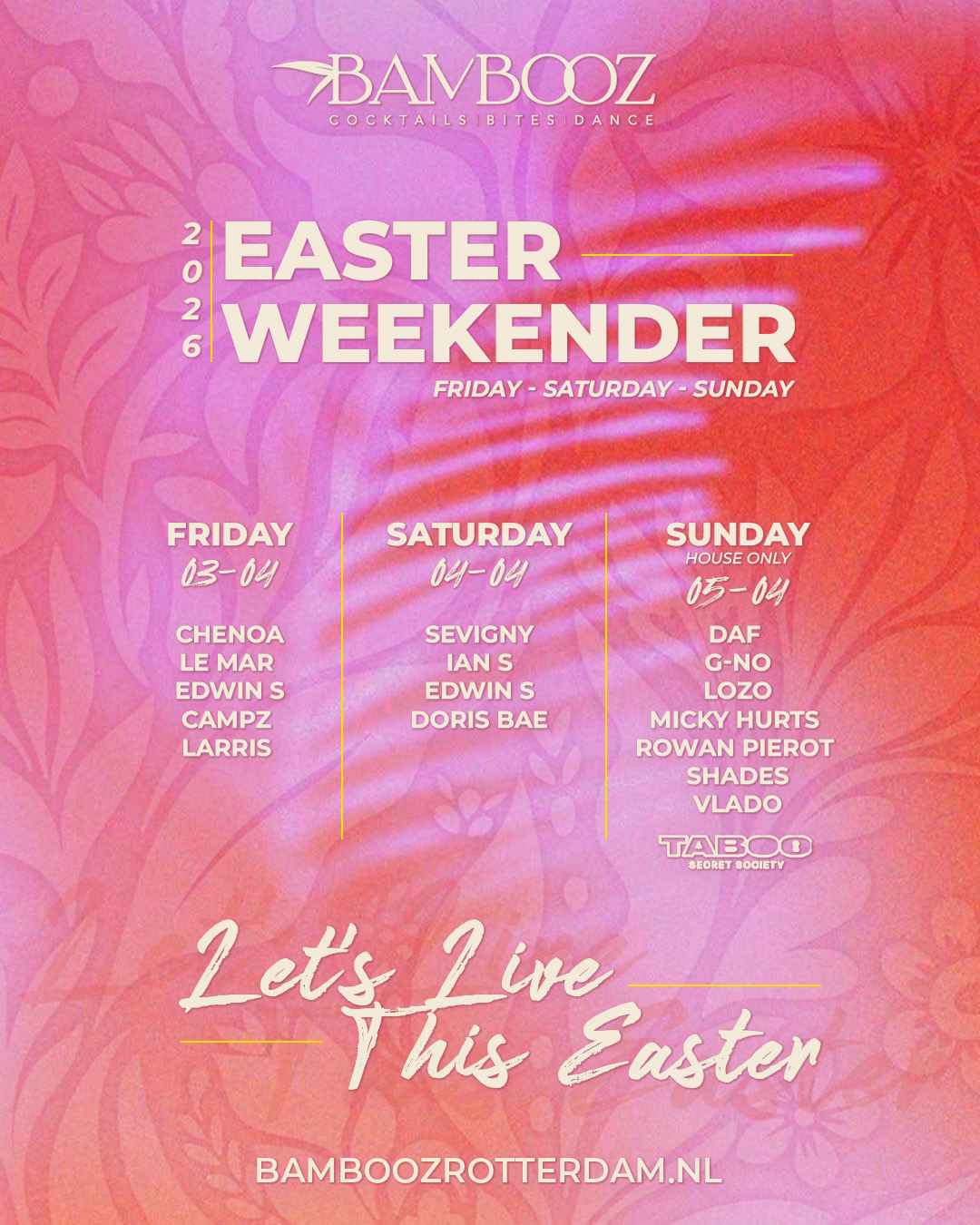 Op 3, 4 en 5 april verwelkomen we je voor een extra lang weekend bij Bambooz.