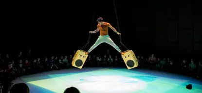 Murmur is circus-geluidstheater dat alle zintuigen prikkelt. Met ruisende rugzakken, een landschap van speakers en een acrobatische componist.