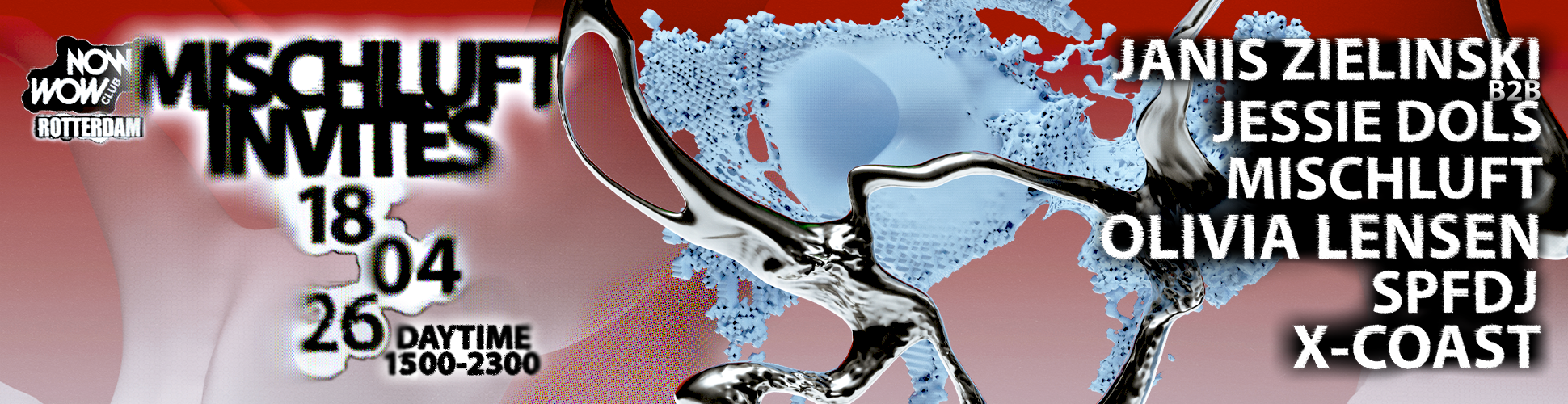 NW x Mischluft clubnacht Op zaterdag 18 april 2026 organiseert Mischluft , in de Now&Wow Club in Rotterdam, een eigen clubnacht. Een geweldige line-up van artiesten zorgt ervoor dat de voetjes van de vloer gaan. Er is een speciale daytime session gepland. Mis deze kans niet! Krijg 1 uur eerder toegang tot de kaartverkoop door je te registreren.