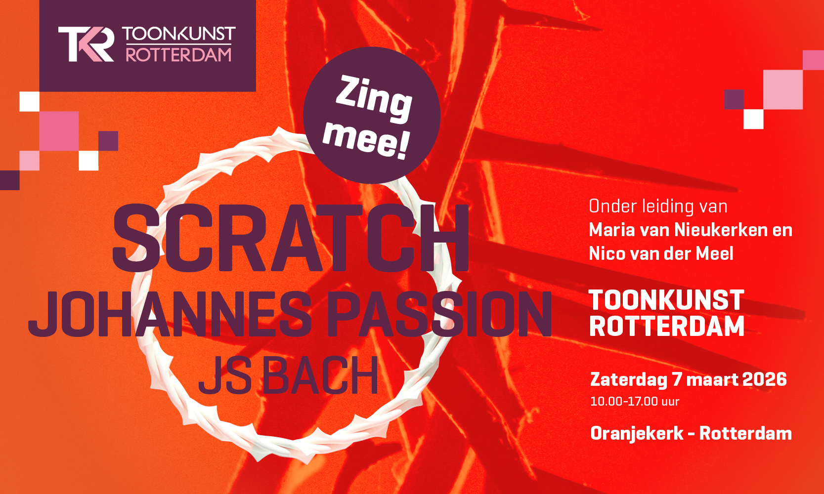 Zing mee met de Johannes Passion! Onder leiding van Nico van der Meel en Maria van Nieukerken, dompel je een dag lang onder in Bachs meesterwerk. Ervaar de kracht van tekst en muziek en laat koor en orkest samensmelten tot een onvergetelijk geheel. Toonkunst Rotterdam nodigt je uit!