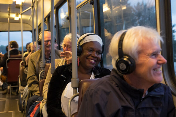 Samen in een retro bus luisteren naar verhalen van 101 Rotterdammers die vertellen over hun thuisgevoel en de wederopbouw van de stad