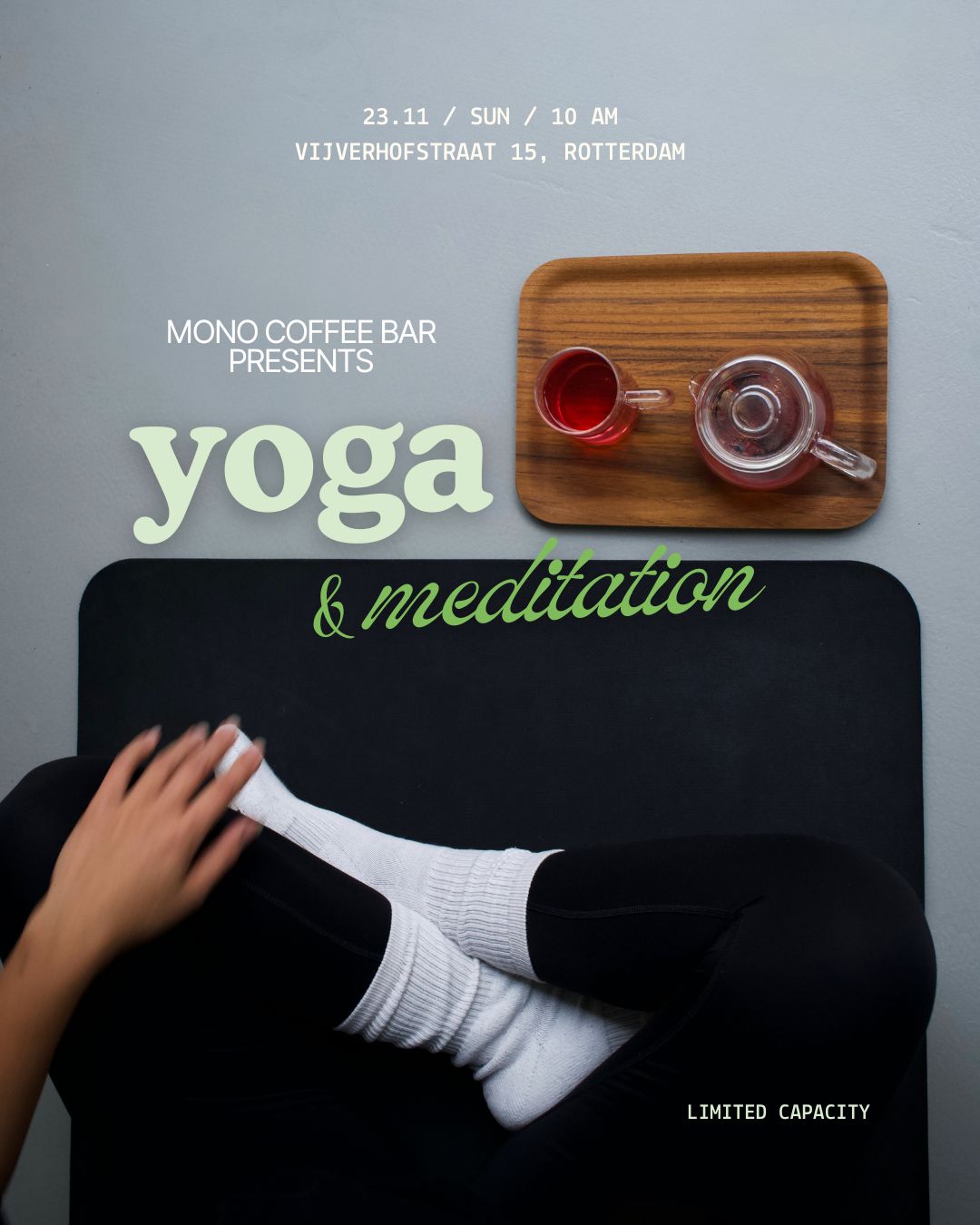 Neem je eigen yogamat mee. Heb je die niet? Neem dan contact op met @mono_coffeebar op Instagram.