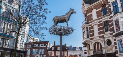 Kijk eens omhoog. Ja daar! Vier grote aluminium ooievaarsnesten, met op een daarvan zelfs een zebra. Dat wekt vast en zeker de aandacht van kinderen. Zebra in de Nesten (2015) is gemaakt door Herman Lamers en verwijst naar het moment toen de zebra’s van Diergaarde Blijdorp letterlijk in de nesten zaten. Tijdens het bombardement in de Tweede Wereldoorlog liepen ze namelijk los door de stad.