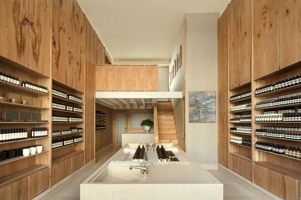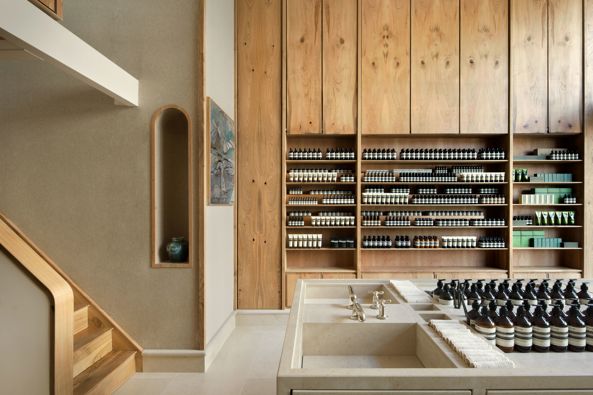 De ingebouwde schappen bevatten het volledige assortiment producten van het merk. Dat omvat huid-, haar- en lichaamsverzorging. Maar ook parfums en accessoires voor lichaam en voor in huis. Sommige van de gebruikte ingrediënten zijn plantaardig, andere zijn in een laboratorium gemaakt en zijn bewezen veilig. Aesop test haar formules of ingrediënten niet op dieren.