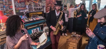 Dichters en muzikanten trekken als gelegenheidsduo van bar naar barbier en brouwerij en van koffie- of platenzaak naar café of atelier. Ze treden overal een kwartiertje op aan de bar. Van spoken word op punkgitaar tot hiphop op accordeon. Wilfried de Jong en gitaarvirtuoos Cok van Vuuren trappen het festival af in café Postiljon.