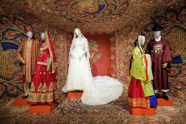 Trouwmode weerspiegelt niet alleen persoonlijke stijl, maar ook de waarden, geschiedenis en sociale structuren van gemeenschappen. Elk kledingstuk vertelt dergelijke verhalen, óók over de eeuwenoude technieken die eraan ten grondslag liggen. Het maken van een trouwjurk is meestal een proces van maandenlange aandacht, toewijding en eerbied voor eeuwenoud vakmanschap. Van handgeborduurde details tot maatwerk dat aansluit bij de wensen van de drager. De tentoonstelling laat zien dat dragers in India en Pakistan trouwjurken laten schitteren met verfijnde borduurwerken van zijden draad, edelstenen en parels, dankzij technieken zoals zardozi, een borduurwerk met metaaldraad. Japanse kimono’s, vervaardigd in een damastweeftechniek, tonen een diep respect voor ambacht en traditie, terwijl Afrikaanse stoffen met handgezette kralenpatronen de rijkdom van vakmanschap belichamen. Europa brengt zijn verfijning met iconisch kant en tule.