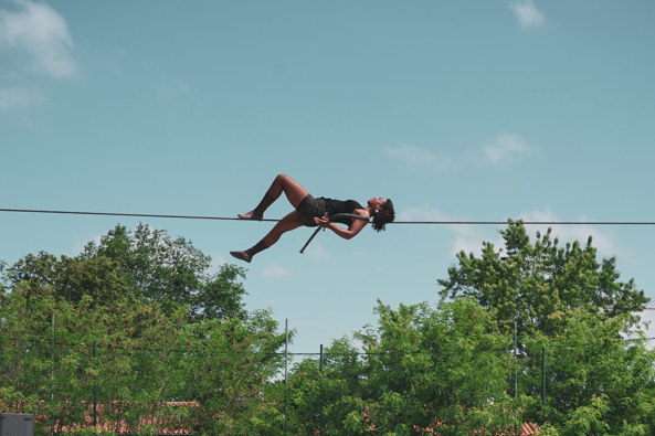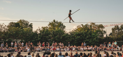 Deze collectieve ervaring mondt uit in een finale met stuwende livemuziek. Daarin danst Tatiana-Mosio Bongonga, een van de weinige vrouwelijke hoge draadlopers ter wereld, die honderden meters over kabels hoog boven steden in heel Europa heeft afgelegd, met delicate precisie en gratie over het koord boven het Afrikaanderplein.