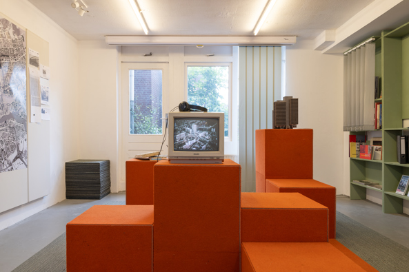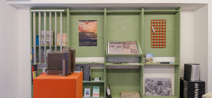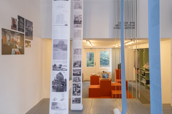 OMI is tijdelijk een wonderlijke kantoorsetting met lamellen en tapijttegels naar ontwerp van Iris van der Wal. In de opvallende ruimte worden markante Rotterdamse gebouwen uit de periode 1965-1990 gepresenteerd.