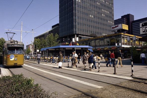 rondom de Blaak zoals de brutalistische Blakeburg en Bibliotheek Rotterdam. De eerste staat op de