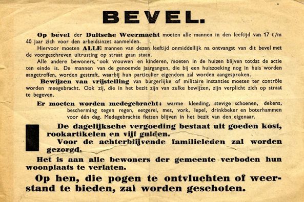 Op bevel der Duitsche Weermacht moeten alle mannen in den leeftijd van 17 t/m 40 jaar zich voor den arbeidsinzet aanmelden.’ Dit bevel wordt in november 1944 per pamflet verspreid in Rotterdam en Schiedam. Daarop volgt op 10 en 11 november de grootste razzia die Nederland tijdens de bezetting heeft gekend. Maar liefst 52.000 jongens en mannen worden afgevoerd naar Duitsland om daar te werken. Op 10 november onthult burgemeester Aboutaleb het Razzia Monument aan de Parkkade om samen te komen, te bezinnen en te herdenken.