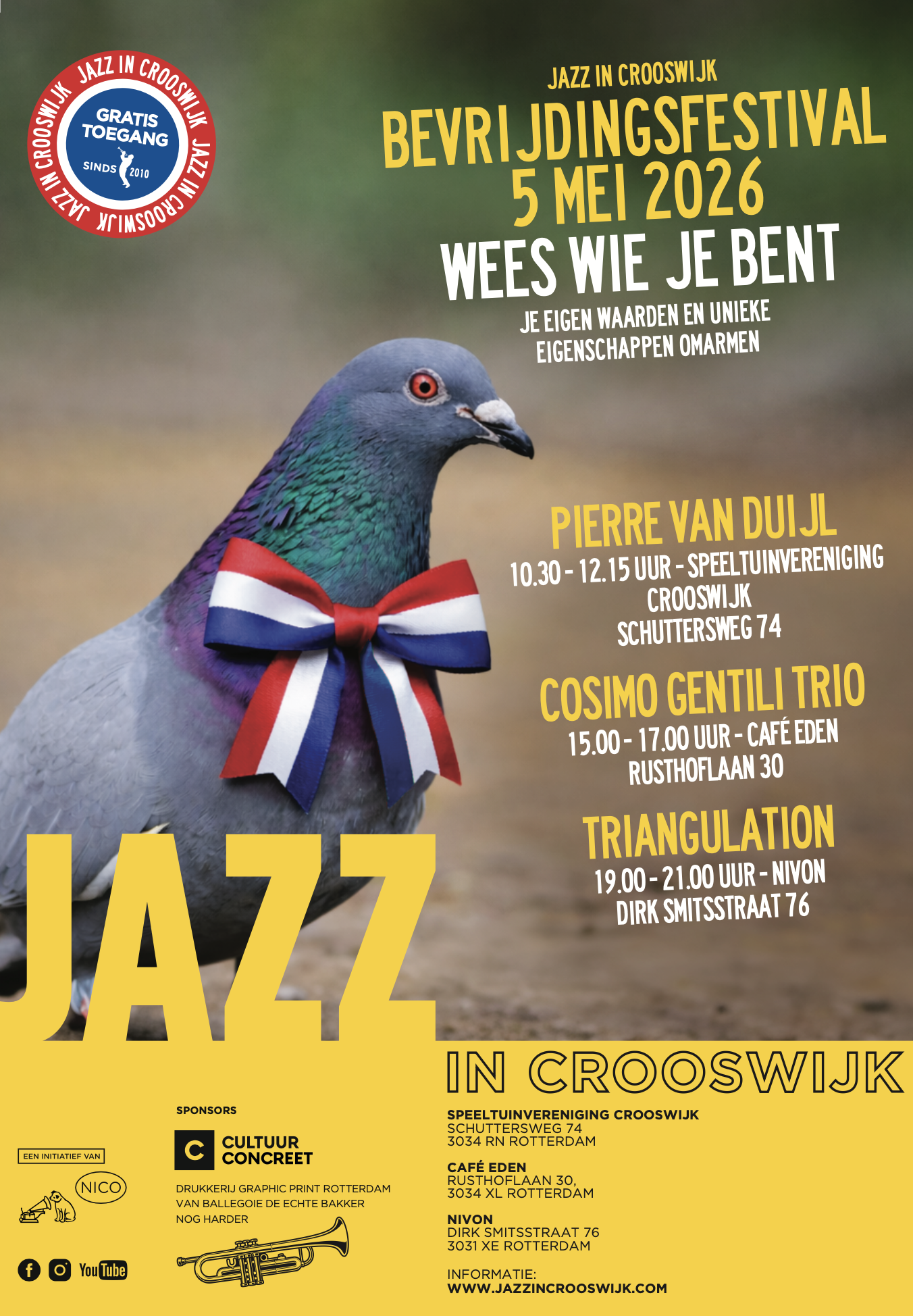 You will enjoy performances at various locations. At 10:30 AM , Pierre van Duijl kicks off at Speeltuinvereniging Crooswijk. This Rotterdam singer performs songs full of humor and melancholy, with jazz influences. At 3:00 PM, the Cosimo Gentili Trio plays at Café Eden. They play energetic and swinging jazz, inspired by Sonny Rollins . Finally, at 7:00 PM, Triangulation provides a unique mix of jazz, classical, and experimental music at NIVON. They incorporate themes such as love and human relationships into their performance. Each concert offers you a unique musical experience.