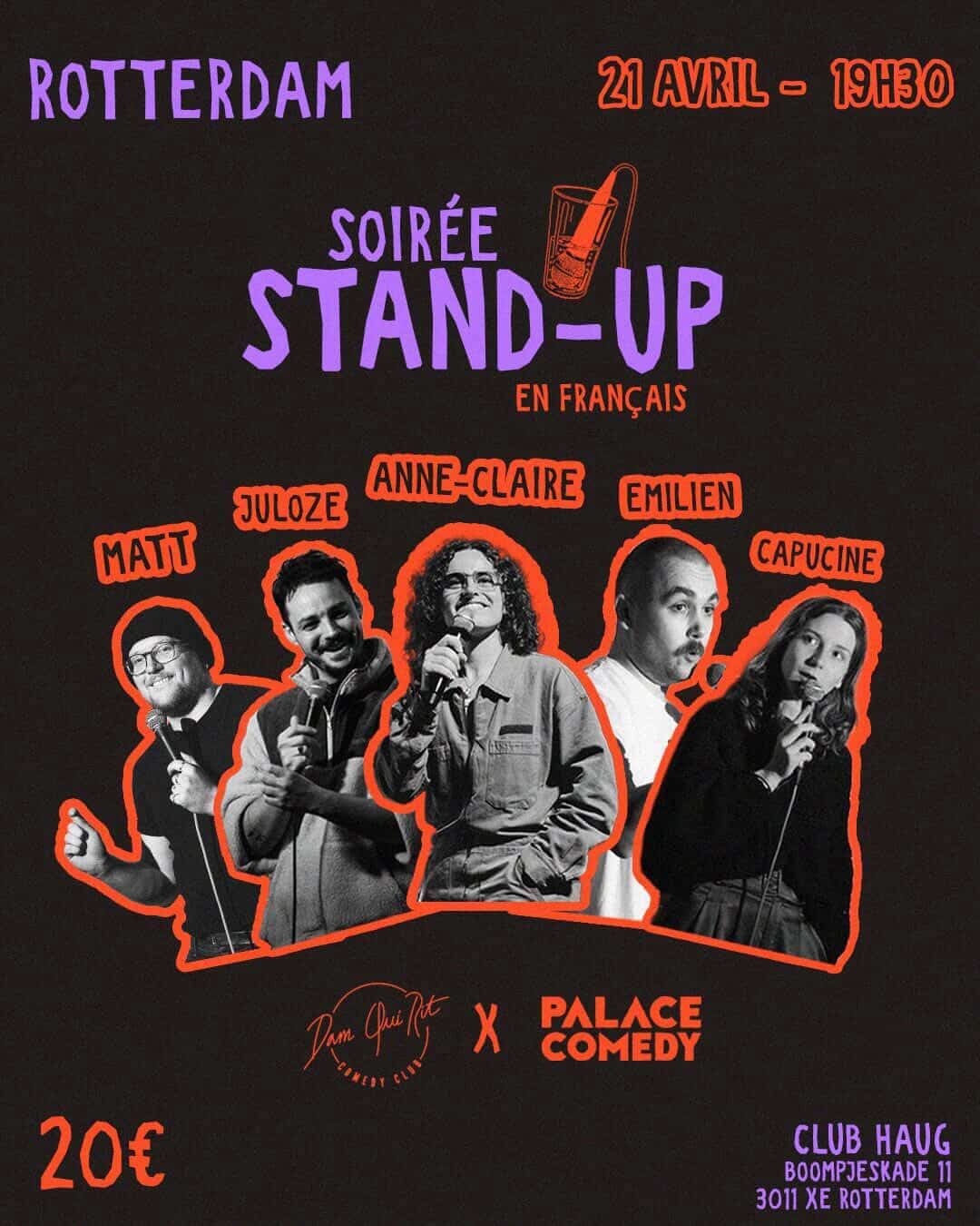 De setting is kleinschalig en direct, waardoor het contact tussen publiek en comedian centraal staat. Regelmatig zijn er ook Engelstalige shows, wat de club toegankelijk maakt voor een internationaal publiek in Rotterdam.
