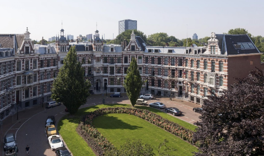 Het Koningin Emmaplein, gelegen in het historische Scheepvaartkwartier van Rotterdam, is een opvallende locatie met een rijke geschiedenis. Ontworpen door architect J.C. van Wijk en gebouwd tussen 1888 en 1891, herbergt het plein 15 statige herenhuizen in de neorenaissance stijl. Deze huizen waren oorspronkelijk de woningen van de elite van het Rotterdamse bedrijfsleven, wat het plein de bijnaam 'Rijkeluishofje' opleverde. De herenhuizen genieten van een prachtig uitzicht op het park Schoonoord aan de achterzijde en keken vroeger uit op het onbebouwde Land van Hoboken aan de voorzijde.