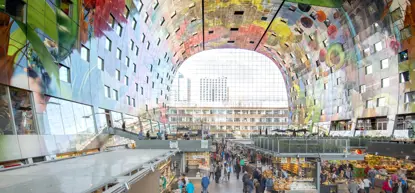 De Markthal is een van de iconen van Rotterdam. Sinds 2014 staat dit hoefvormige gebouw, ontworpen door MVRDV, op de Binnenrotte. In de overdekte foodhal vind je eten en drinken van over de hele wereld, zowel bij de diverse stands als de restaurants die hier gevestigd zijn.